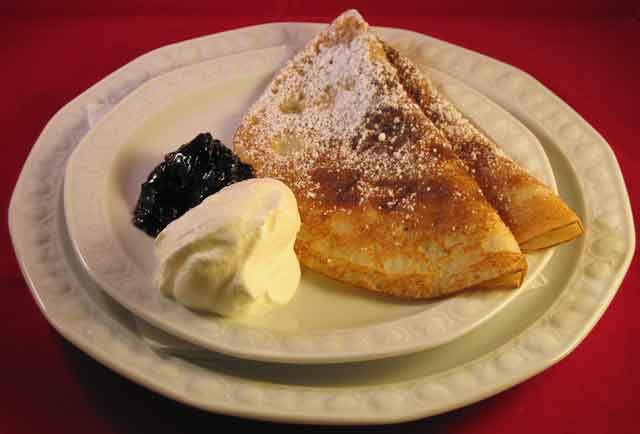 Lägg upp pannkakorna på en större tallrik, sikta över florsocker med hjälp av en sil. Servera med vispgrädde, jordgubbs- och blåbärssylt