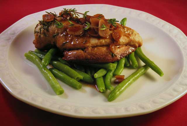 Kycklingfilén bräseras tillsammans med vitlök och timjan i rödvinsvinäger. Serveras sedan på en bädd av haricot verts. En rätt som passar bra en kväll då inte hungern är allt för stor.