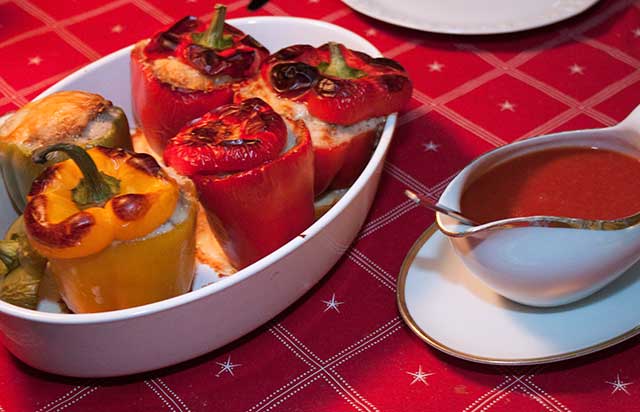 Färserad paprika hade vi inte ätit sedan tidigt 80-tal, då Bull en kväll tyckte att det var alltför många paprikor i kylskåpet. Recepten vi hittade i Bulls gamla kokböcker kändes förlegade, så vi provade en egen, ny variant på maträtten. Det fanns både röda, gula och gröna paprikor i kylen, och vi provade alla. Finast smak får man med gröna paprikor anser både Bull och Bratt. Vi serverade endast en tomatsås till, och då får man räkna med att det går åt två paprikor per person.
