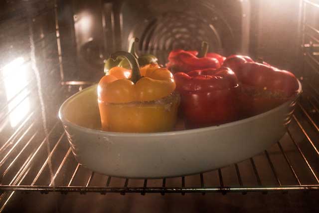 Börja med paprikorna. Skär ett lock av toppen, där skaftet sitter. Ta ur inkråm och kärnor. Skölj paprikorna.