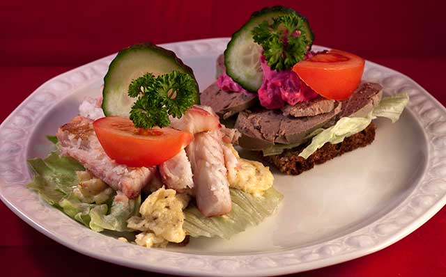 På bilden visas ett smörrebröd med rökt ål och äggröra, och ett med leverkorv och rödbetsallad. Men man kan göra läckra kreationer även med julskinka, sill, eller gravad lax.